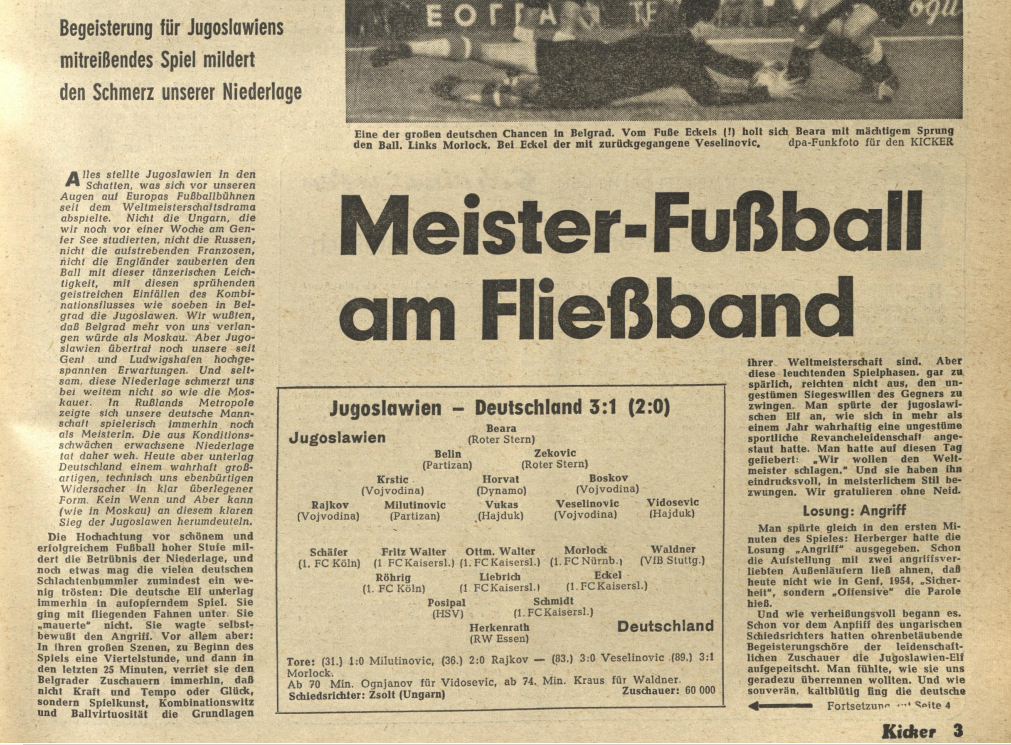 The defeat in Belgrade was deserved yet a bit unlucky as two goals were ruled out due to off-side and the post was hit three times. For the next game Herberger refrained from calling up Rahn, Morlock and Ottmar Walter who were all not fit enough after various injuries. The high number of forwards showed that Herberger emphasised attack for this game.