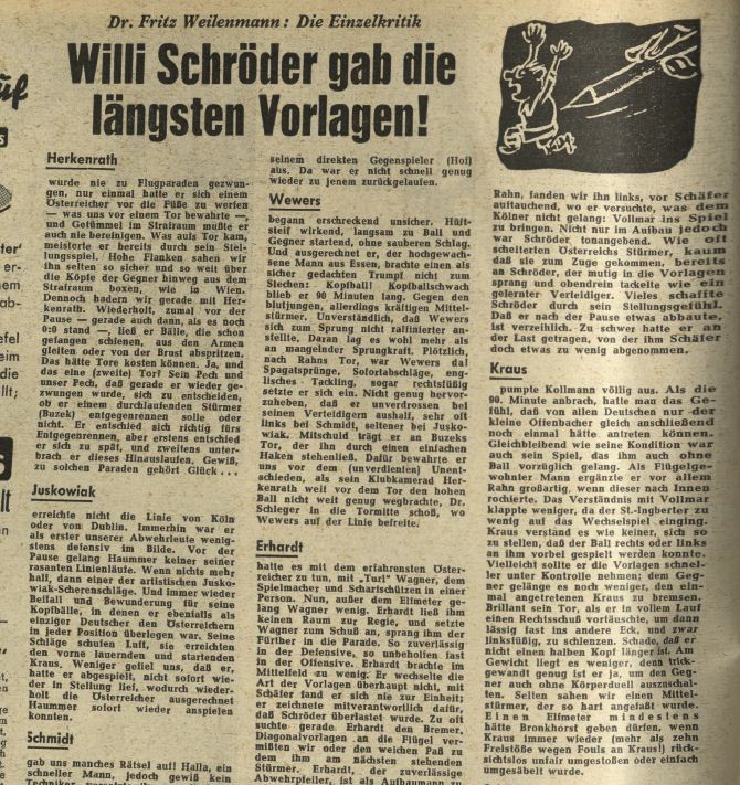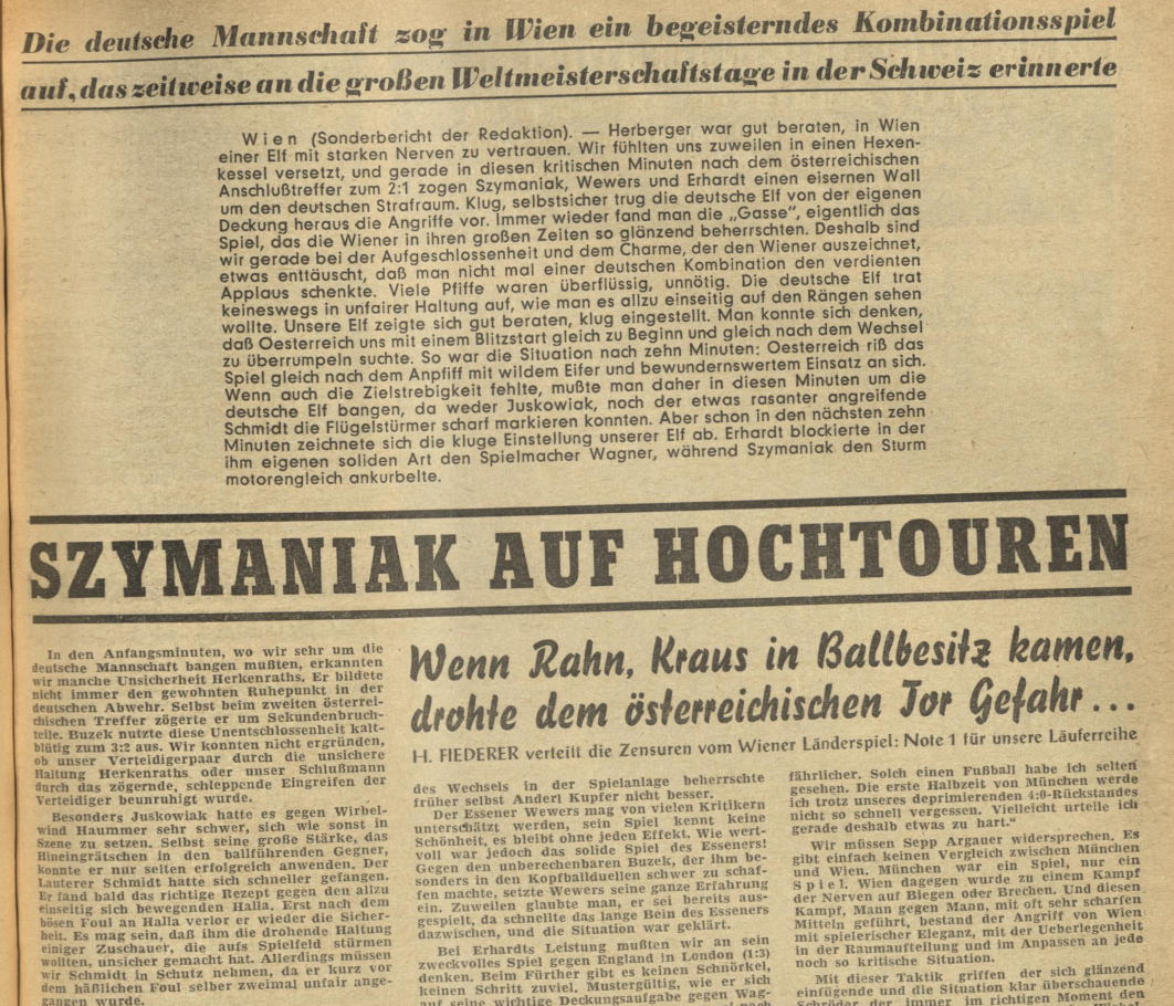 1956’s last game saw a sound and highly deserved victory against Belgium which brought calm and gladness to the German camp after an overall very sobering year. With Szymaniak, Geiger and Kelbassa three fine new players had emerged and finally the team had played with determination again. The roster for the first game in 1957 against Austria comprised 16 players. Among them the newcomers Jagielski, Borutta and Alfred “Aki” Schmidt, the only one of these to manage an international career. Still without out cap was goalkeeper Hans Tilkowski.