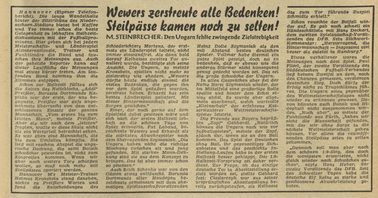 Germany: 1 Sawitzki – 2 Erhardt, 5 Herbert Schäfer, 3 K.Schmidt – 4 Mai, 6 Szymaniak – 8 A.Schmidt, 10 Schröder – 7 Peters, 9 Kelbassa, 11 Hans Schäfer (c) (74. Klodt)