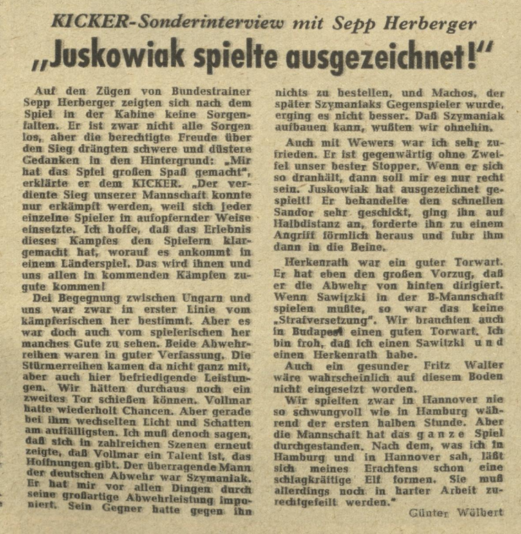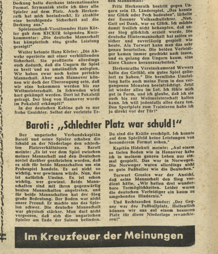 The victory against the Swedes was a lucky one and in no way a convincing performance. After over three years the Hungarians were given the chance to exact revenge on the German team. However in the meantime the political developments had torn apart the great Hungarian team. Only goalkeeper Grosics, half back Bozsik and playmaker Hidegkuti were still in the team. The other great stars, most notably Puskas, Kocsis and Czibor, had emigrated to western Europe after the 1956 uprising and were hired as professionals by big clubs. In the German team also many changes had occurred, five players that had been part of the 1954 squad in Switzerland were still (or again) on board: Horst Eckel, Karl Mai, Max Morlock, Hans Schäfer and again Fritz Walter. Herberger’s favorite player had commended himself with excellent performances for his club Kaiserslautern.