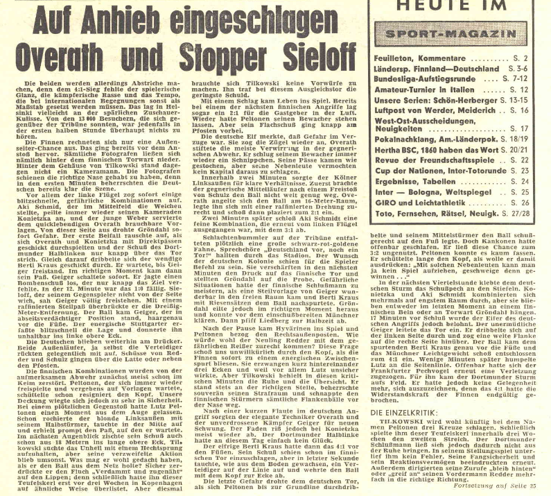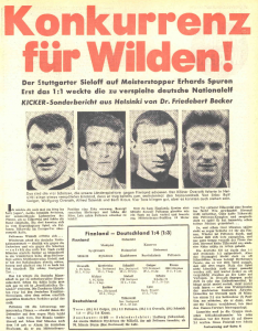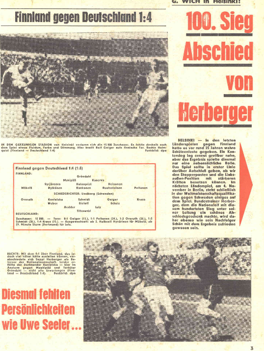 Scorers: 0-1 Geiger (13.), 1-1 Peltonen (24.), 1-2 Overath (36.), 1-3 A.Schmidt (39.), 2-3 Kraus (71.)